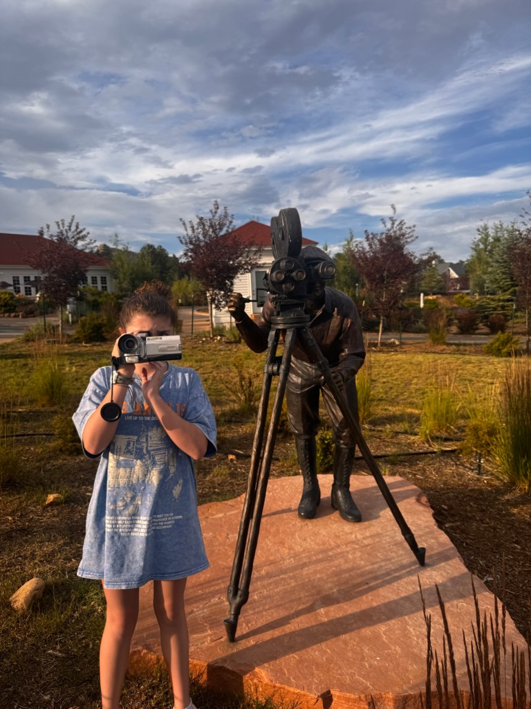 Outside, there’s a statue of an old-school filmmaker behind a tripod camera. Novi walked right up to it with our estate-sale score camcorder—early 90s, clunky joy—and lined up like she was filming him back. I got the shot. Then stood there for a second, just watching.